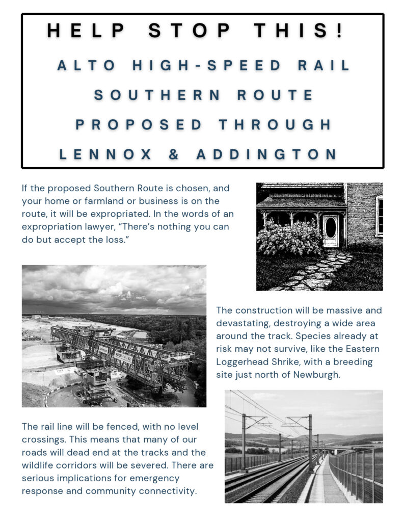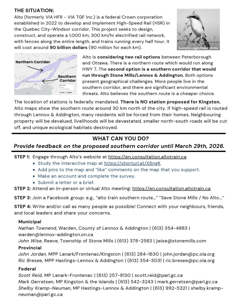 You may have heard that ALTO (the federal agency leading Canada’s high-speed rail initiative) is actively considering a southern route for a new high-speed rail corridor through our region. This proposal has significant implications for the lands, rivers, and communities we care about.